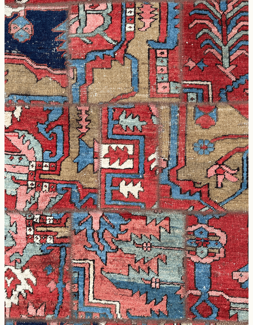 Crafted from the resilient remnants of a once-glorious 19th-century Heriz Persian rug, this exquisite creation seamlessly blends the elegance of tradition with the innovation of contemporary design. Each patch tells a story, preserving the heritage of the past while embracing the ethos of sustainability through recycling.