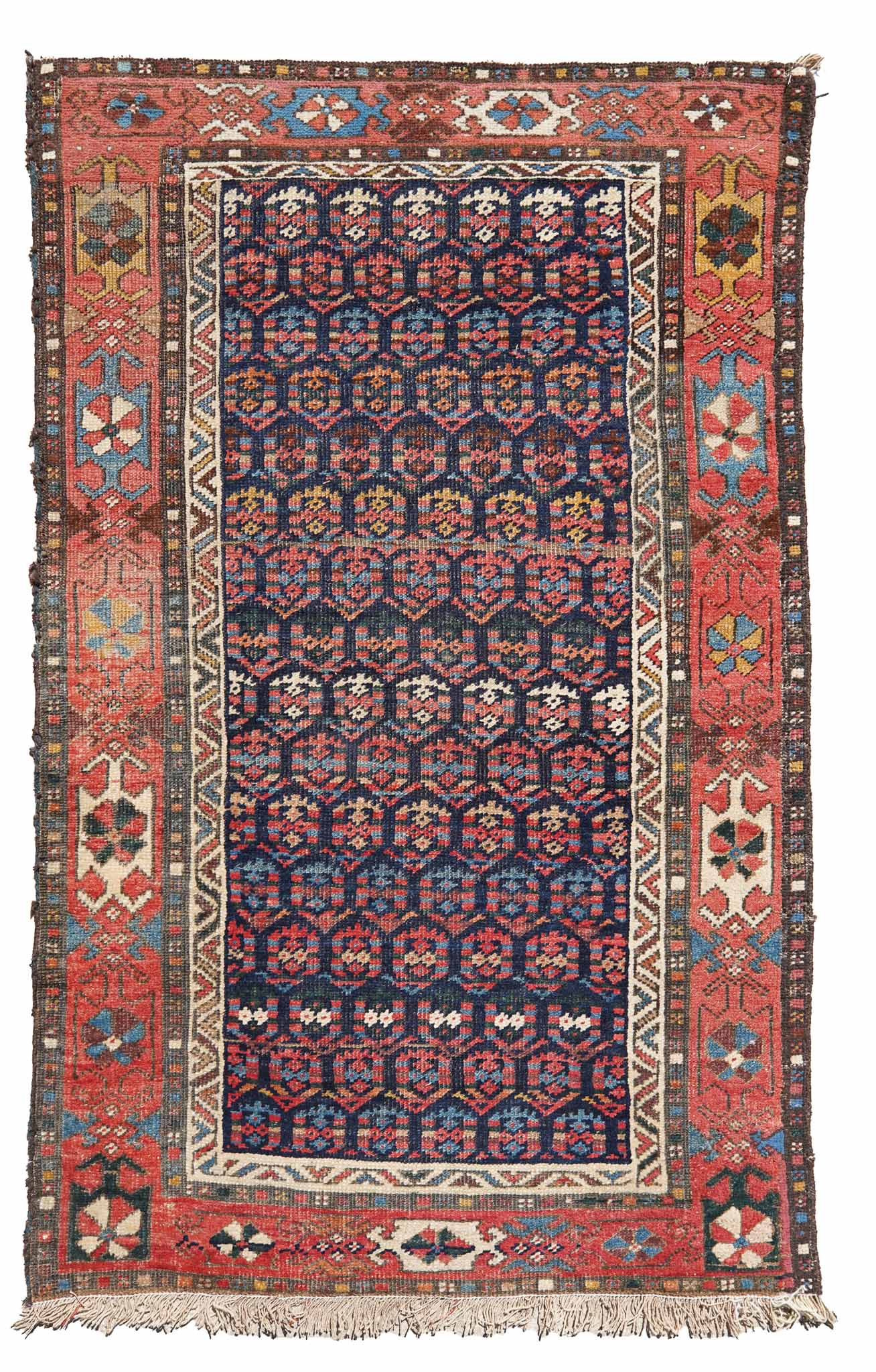 An elegant tribal piece featuring a colourful repeated 'boteh' motif on a calming blue ground. The all-over central design is balanced with a lovely spacious border.