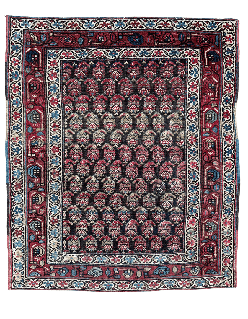 Featuring a dense array of boteh or paisley patterns on a dark field, framed by decorative borders with floral and geometric motifs, in a colour palette of reds, blues, and neutrals.