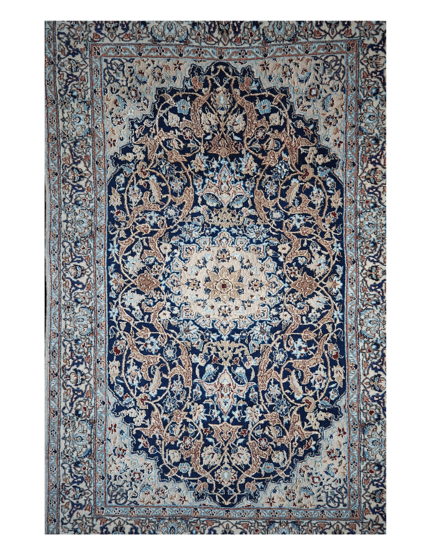 An antique Part-silk Nain rug with delicate traditional design. The gentle blue and ivory colour palette with silk details gives the piece a very light feeling.