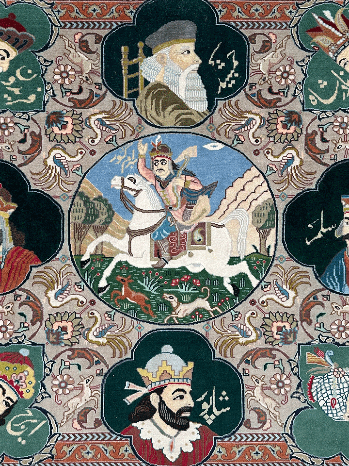 Celebrate history with this rug showcasing ancient Persian kings, including Bahram Shah at the center, alongside Nader Shah, Jamshid, Fereydon, Iraj, and Ardashir