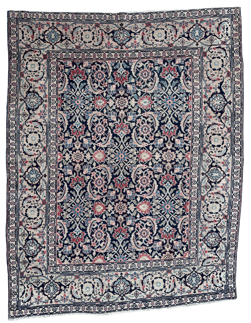 Featuring a dense field of floral motifs and curvilinear designs, a hallmark of Persian rug weaving.