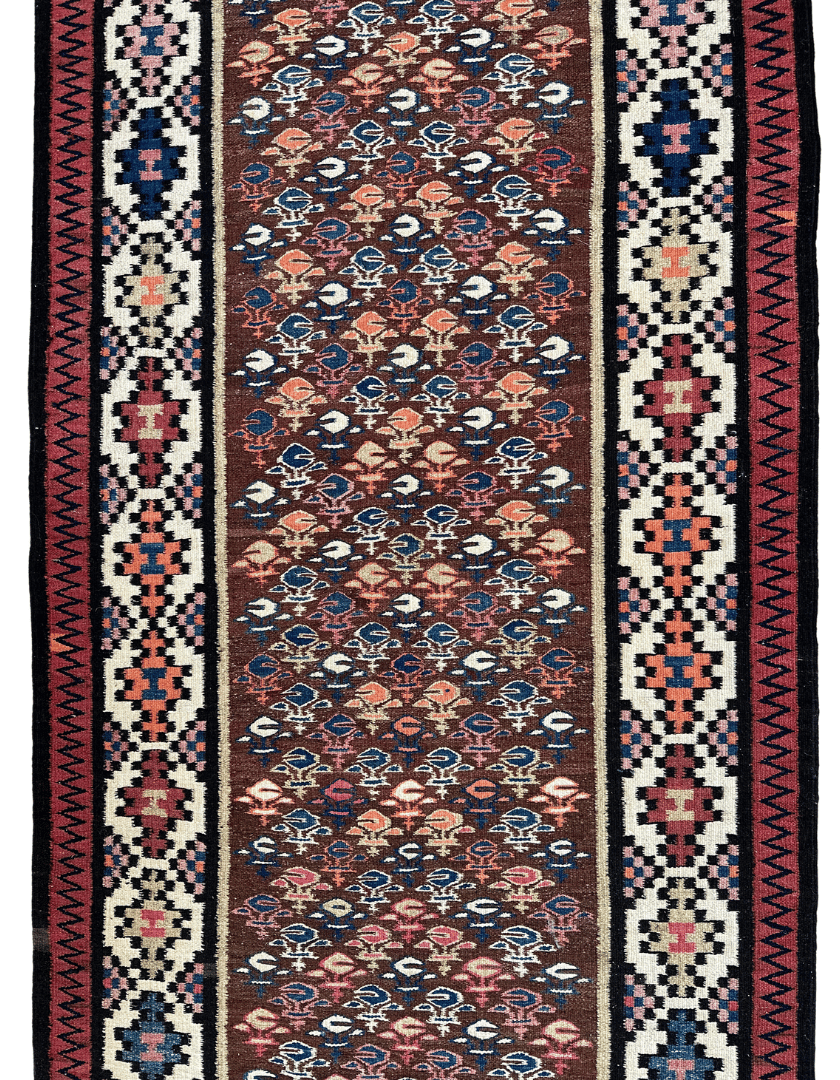 This stunning tribal kilim features the interlocking tapestry weave technique, similar to the desirable Bessarabian and Ukranian kilims. Most kilims have a gap where the colour changes. However, with this kilim the weaver has connected the weft where the colour changes, resulting in a continuous tight weave throughout the kilim.