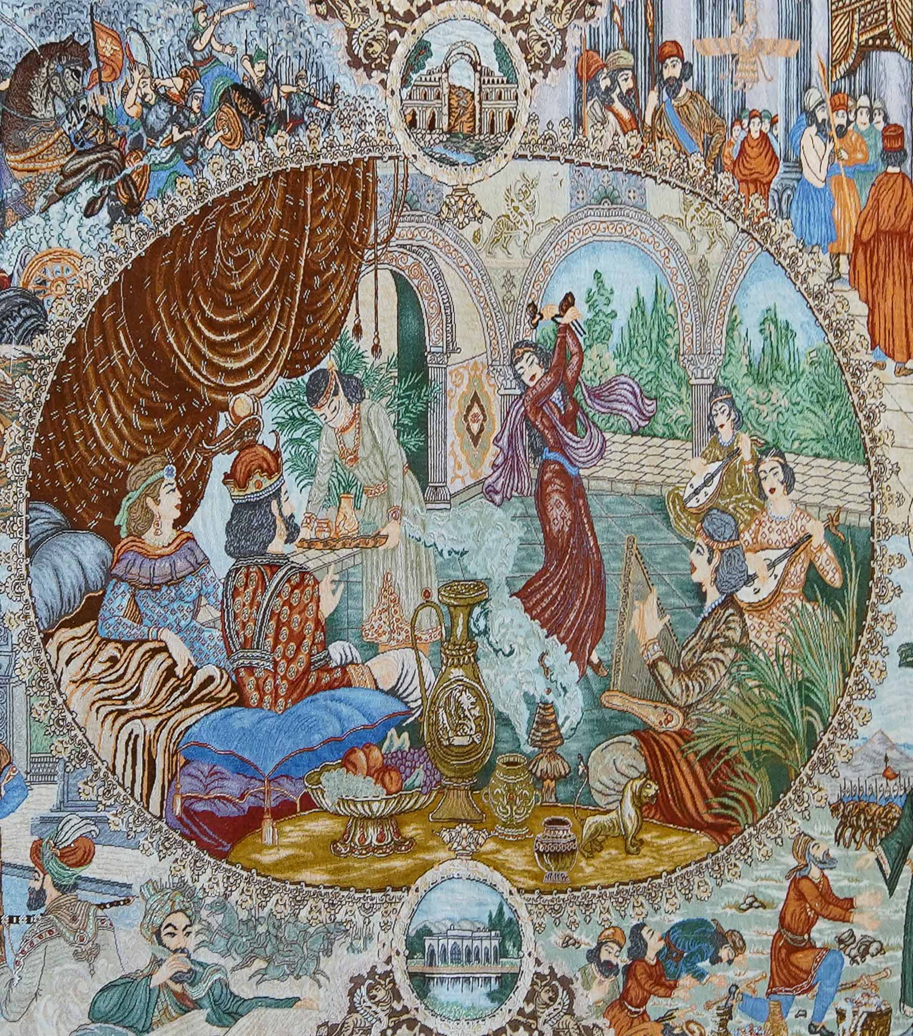A fine part-silk rug depicting ancient Persian royalty.