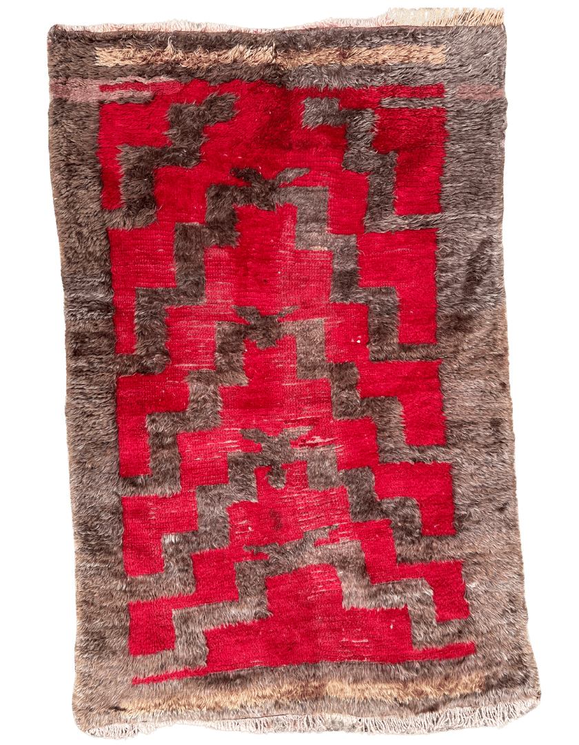 This mid-century Tulu Turkish rug presents a strikingly contemporary design with its abstract, geometric pattern. Though vintage, its aesthetic is remarkably modern, making it a rare and sought-after piece.